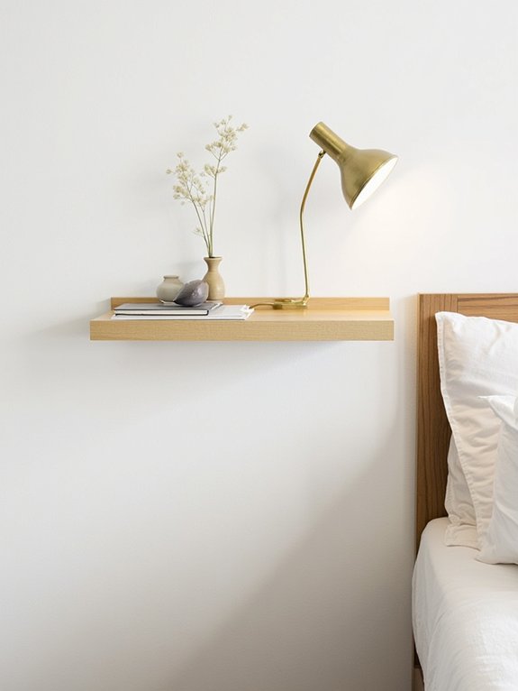 Installation options range from simple white floating shelves to clear acrylic models and wooden platforms with concealed mounting hardware. Each design maintains clean lines and serves practical functions while contributing to an uncluttered aesthetic. The slim profiles and strategic placement at mattress height ensure convenience without compromising the room’s spacious feel.