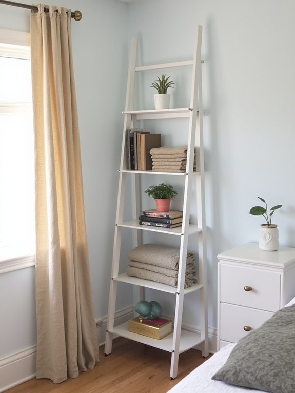 Corner ladder storage units offer an elegant solution for maximizing vertical space in bedroom corners. These units transform traditionally unused angles into functional storage zones while maintaining a light, airy aesthetic that won’t overwhelm the room.