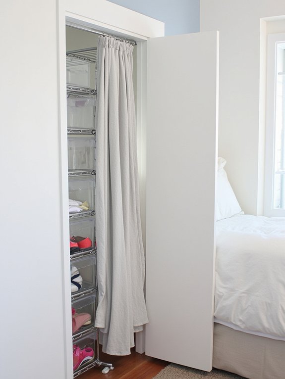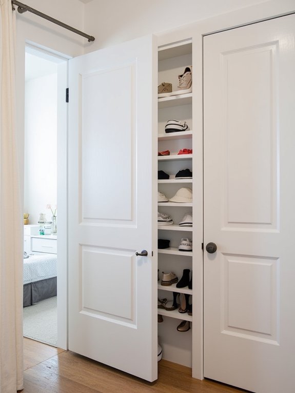 The back of your bedroom door provides valuable vertical storage space perfect for organizing shoes. By installing an over-the-door organizer with clear pockets or tiered metal shelving, you can store dozens of pairs while keeping them easily visible and accessible.