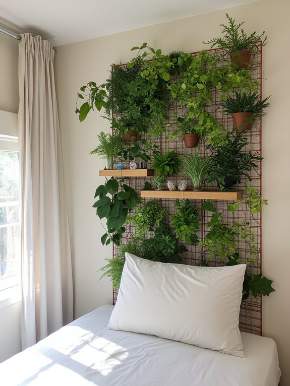 A vertical wall garden display transforms unused wall space into a living tapestry of greenery, making it ideal for small bedrooms where floor space is limited. By mounting plants vertically, you can enjoy the benefits of indoor gardening without sacrificing precious square footage.