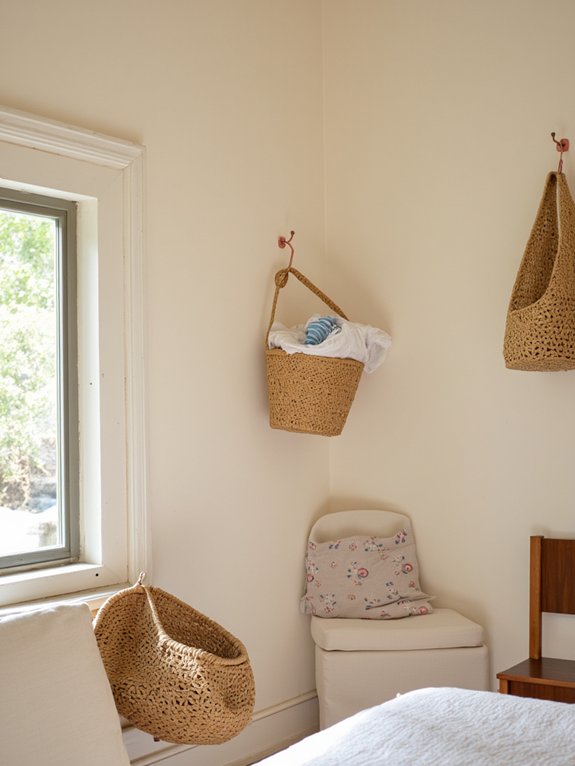 Hanging storage baskets provide an efficient vertical storage solution while enhancing your tiny bedroom’s aesthetic appeal. By mounting these versatile containers on walls or suspending them from the ceiling, you can keep essentials organized and easily accessible while freeing up valuable floor space.