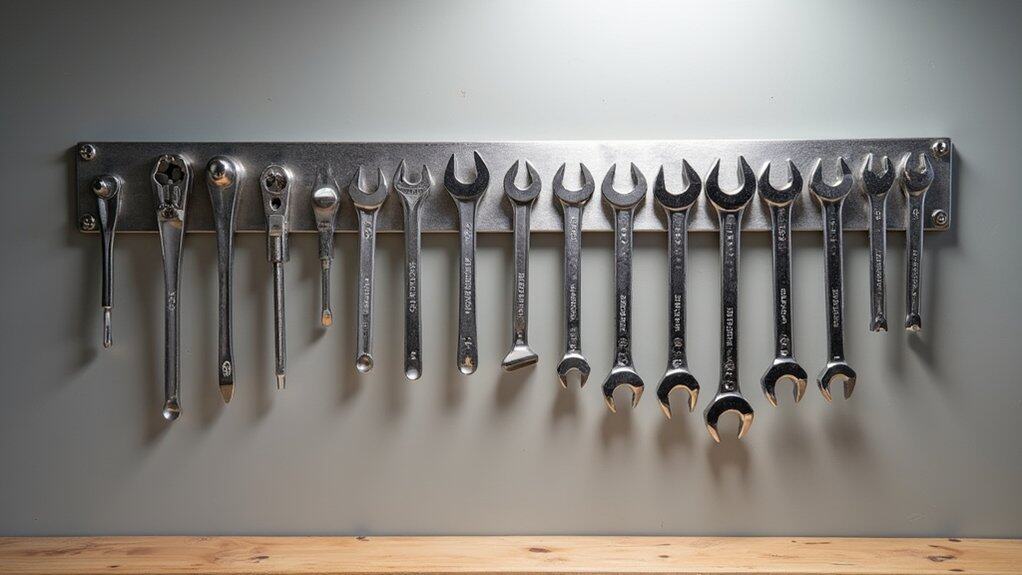 Magnetic tool strips are an excellent way to keep frequently used tools easily accessible and off your workspace. Start by selecting a strong magnetic strip, which can be found at hardware stores or online, and guarantee it is long enough to hold multiple tools. Mount the strip securely on a wall or the side of a workbench using screws or heavy-duty adhesive, positioning it at a height that is comfortable for reaching.