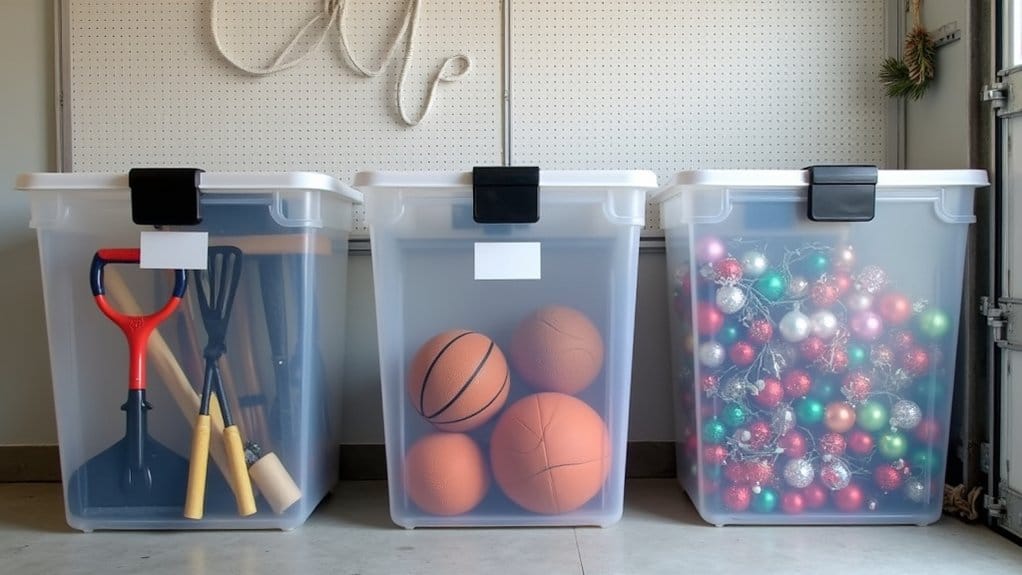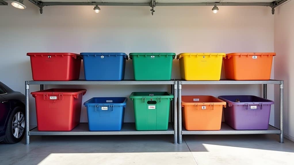 When organizing bins in your garage, grouping similar items together is a practical approach to maintain order and ease of access. Start by categorizing tools, sports equipment, seasonal decorations, or automotive supplies into distinct groups. This method guarantees that you can quickly locate what you need without rummaging through unrelated items.
