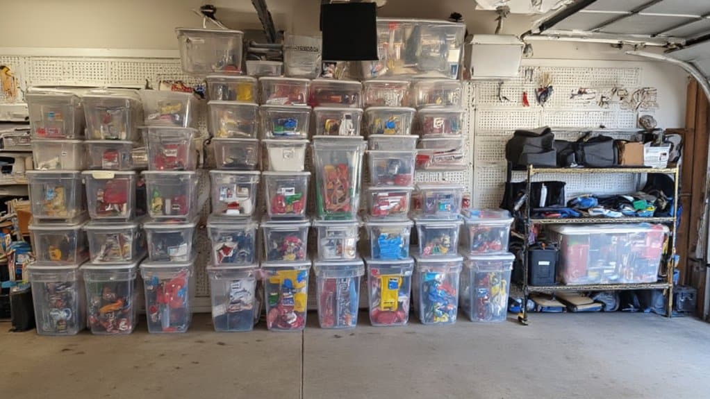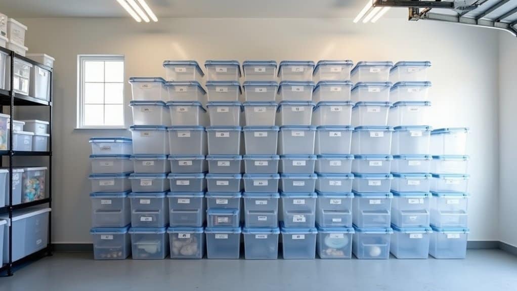 Stacking bins vertically in your garage is an efficient way to maximize storage space and keep items organized. Start by selecting sturdy, stackable bins with flat lids to guarantee stability when placed on top of each other. Place heavier items in the bottom bins to create a solid base and prevent toppling, while lighter items can go in the upper bins for easy access.