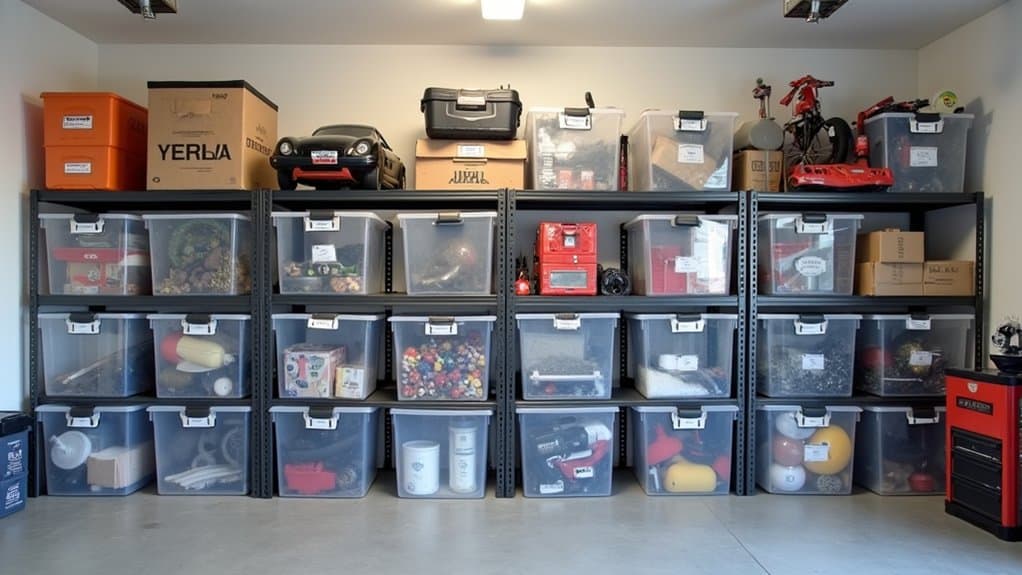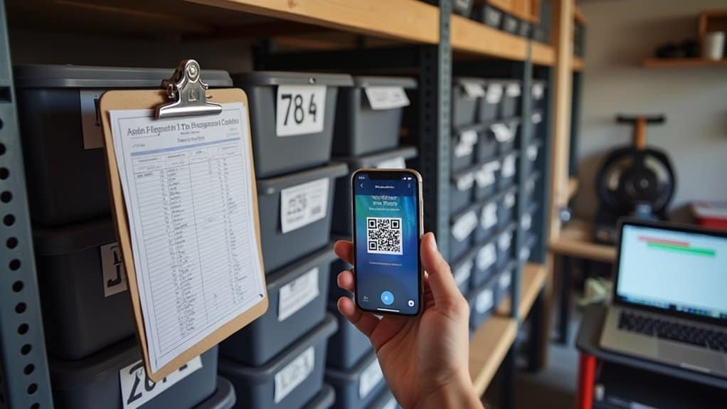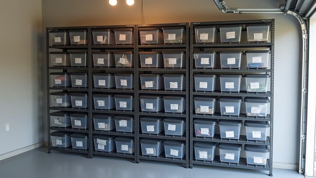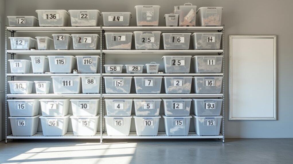 Creating inventory lists is an essential step in maintaining an organized garage, as it helps you keep track of what’s stored in each bin. Start by labeling each bin with a unique identifier, such as a number or descriptive name, and list its contents on a separate inventory sheet or digital document. This documentation guarantees you can quickly locate items without rummaging through multiple bins.