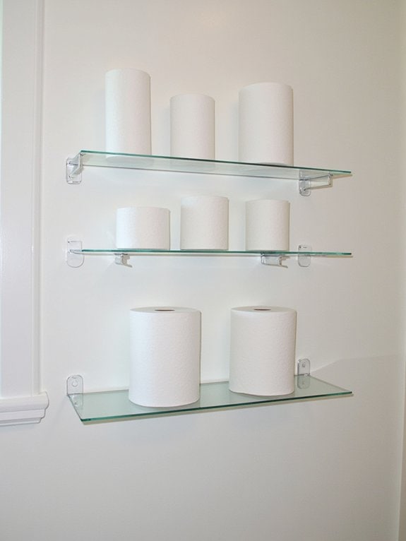 Floating glass shelves offer a contemporary storage solution for displaying toilet paper rolls in bathrooms. The transparent design creates visual lightness while providing practical organization and easy access. The sleek, minimalist aesthetic helps maximize the sense of space.