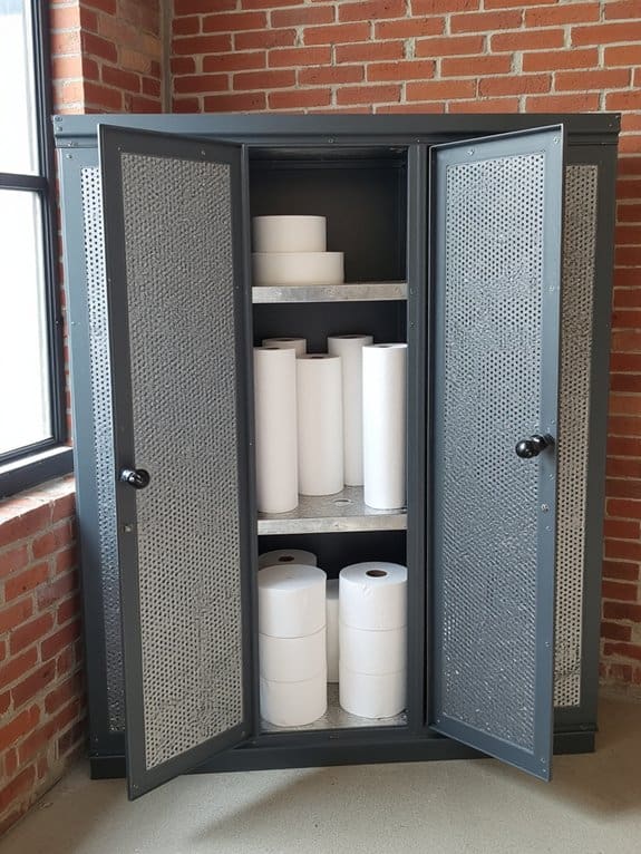 Industrial metal storage cabinets provide robust construction and organizational space for storing bathroom supplies. Their durable metal design resists moisture while offering a stylish industrial look that keeps toiletries and essentials organized behind secure doors.