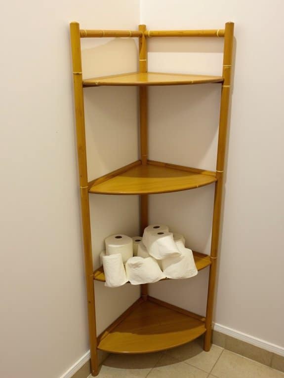 The stands typically feature 3-4 tiers for ample storage capacity and come with protective feet to prevent water damage. Made from water-resistant bamboo, these units combine durability with natural aesthetics, measuring around 12 inches wide by 24 inches tall to accommodate standard bathroom corners.