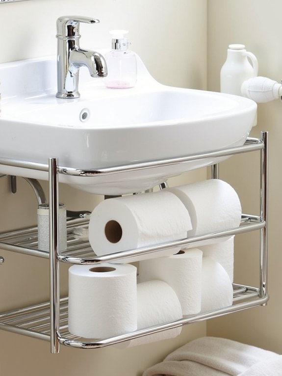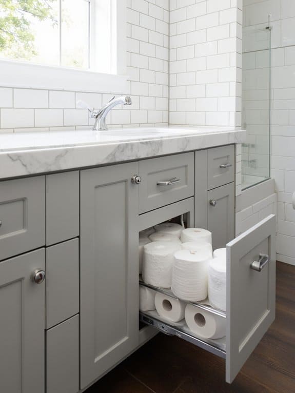 Hidden under-sink storage drawers offer a smart solution for maximizing unused bathroom space. By installing a pull-out drawer system beneath your vanity, you can create a concealed spot for storing toilet paper rolls while protecting them from moisture and dust.