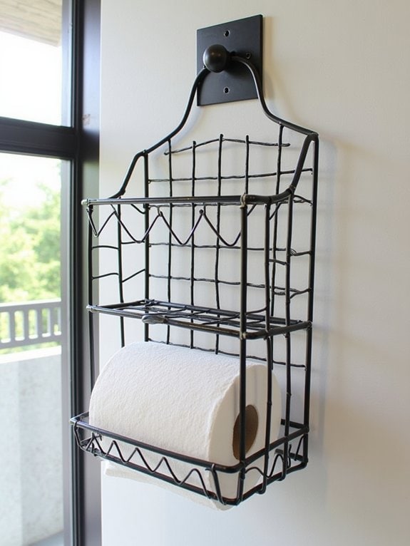 A modern minimalist toilet rack offers a sleek storage solution that transforms bathroom aesthetics while maximizing space efficiency. The clean lines and thoughtful design keep toilet paper rolls readily accessible without creating visual clutter.