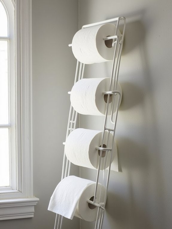 A ladder-style rolling storage rack combines vertical organization with mobility to efficiently store toilet paper rolls in the bathroom. The unit features graduated shelves that accommodate up to 12 rolls while utilizing minimal floor space.