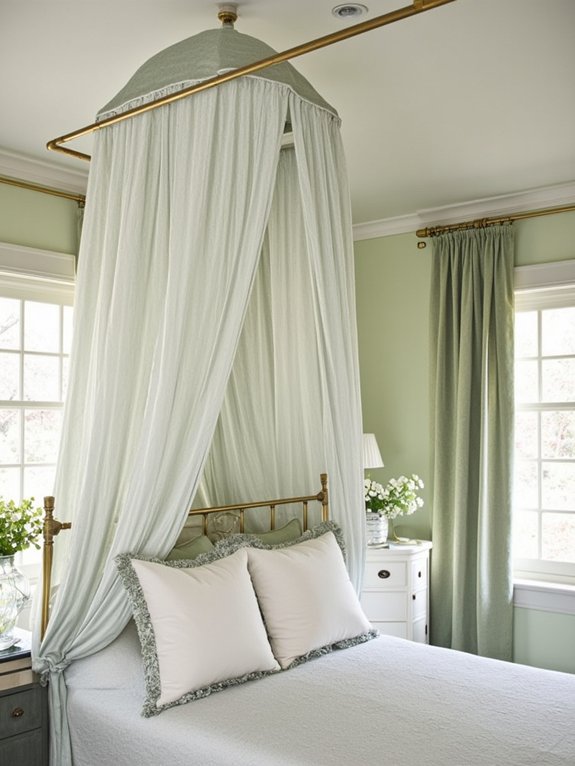 Sage velvet canopies transform ordinary bedroom ceilings into elegant focal points, creating an intimate atmosphere while adding architectural interest through flowing fabric panels. The soft, heavyweight velvet fabric in sage green captures and reflects light while providing subtle sound dampening properties.