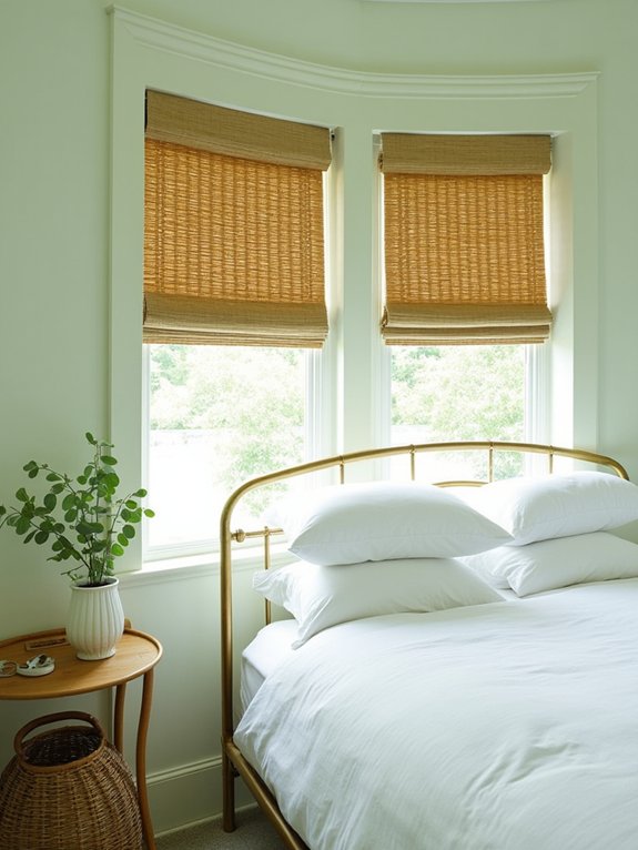 Sage-colored woven window valances provide an elegant window treatment option that filters natural light while adding visual interest to a room. These decorative toppers are best mounted 4-6 inches above window frames to achieve balanced proportions and can be paired with sheer panels for customizable privacy control.