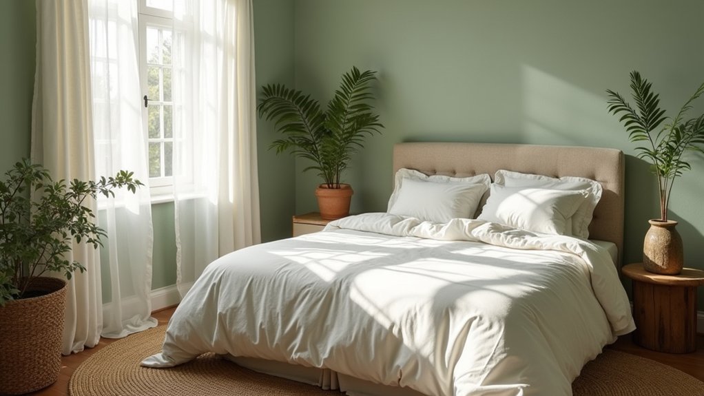 A sage green accent wall creates a stunning focal point that dramatically transforms any bedroom’s atmosphere. The matte-finished feature wall, particularly when positioned behind the bed, establishes a sophisticated foundation for the room’s design while minimizing light reflection.
