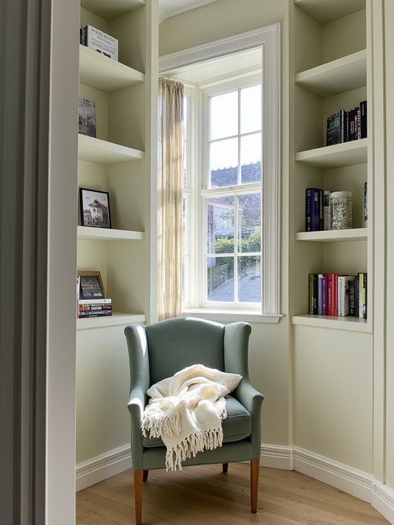 A sage green reading nook transforms unused space into a tranquil retreat for reading and relaxation. By incorporating sage-painted bookshelves and comfortable seating, this dedicated area becomes an inviting spot for literary escapes. The calming color helps maintain focus while reducing eye strain during long reading sessions.