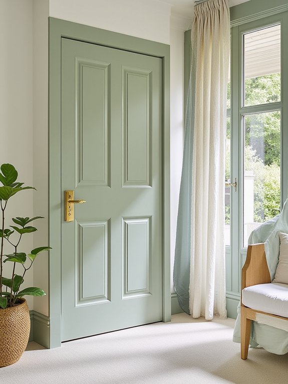A statement door painted in sage green serves as a striking focal point in a bedroom while complementing the overall design scheme. When combined with matching doorframe accents and hardware, this architectural element becomes an elegant feature that enhances the room’s aesthetic appeal.