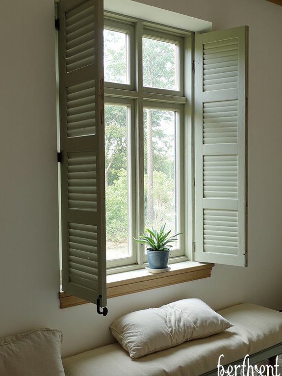 The shutters come in plantation or classic panel styles and can be customized with moisture-resistant materials for humid environments. Bi-fold options allow easy window access, while the sage studs, typically spaced 2 inches apart, can coordinate with sage wall colors for a unified design scheme.