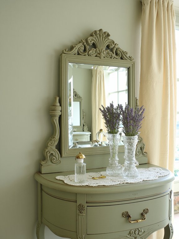 The mirror’s placement at an optimal height, coupled with carefully curated vintage accessories, creates an elegant dressing area that seamlessly integrates with sage accent walls. This thoughtful restoration transforms a classic piece into a personalized statement that honors traditional design while meeting modern styling needs.