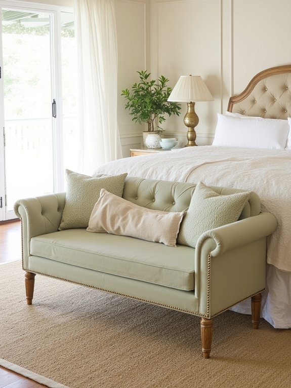 Sage upholstered bench seats combine style and functionality, offering elegant seating solutions that complement bedroom decor while providing hidden storage space. Available in various upholstery options from tufted velvet to classic linen, these versatile pieces serve dual purposes as both seating and storage units.