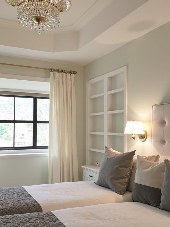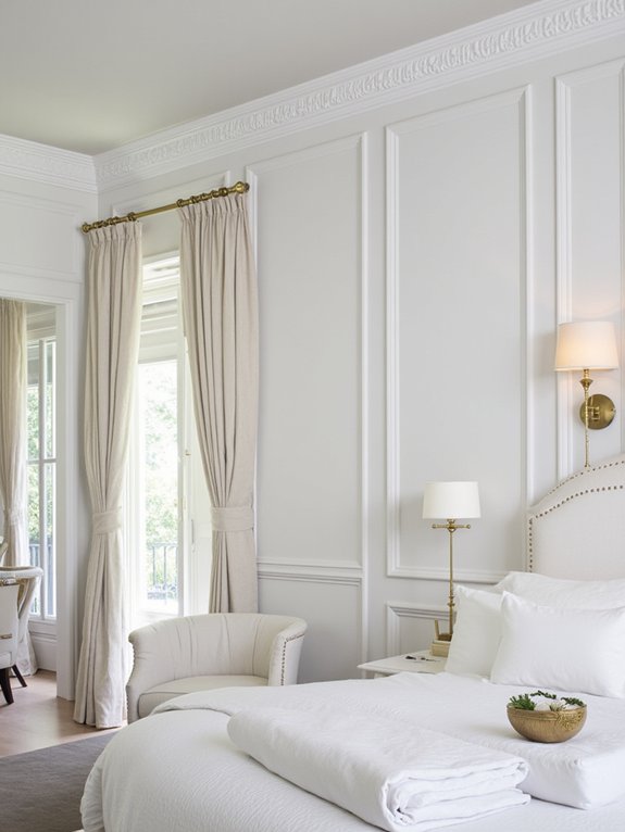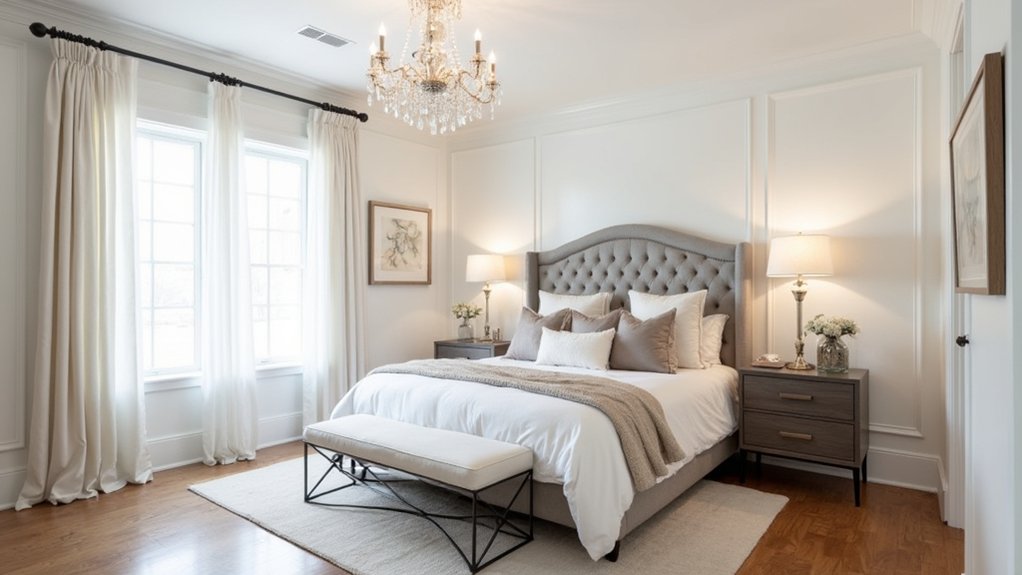 Decorative molding adds architectural sophistication to bedrooms through the strategic use of crown, chair rail, and panel details. These applied elements create visual interest and help define distinct areas within the space, making them popular choices among professional designers seeking a timeless transitional look.