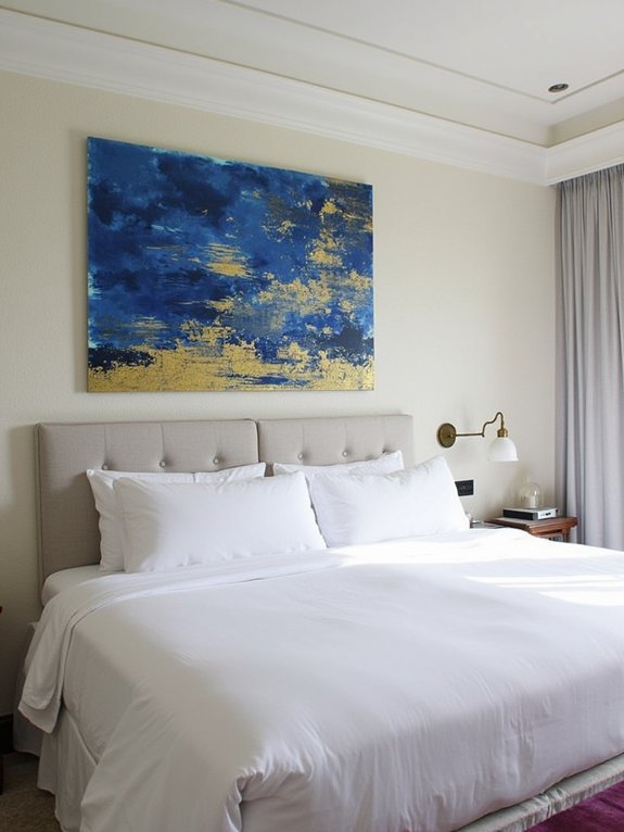 Modern artwork above a bed’s headboard can transform a bedroom into a personalized retreat while merging contemporary and traditional design elements. The key is selecting pieces that complement the room’s existing aesthetic while creating an impactful focal point.
