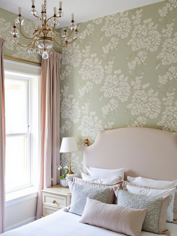 Positioning the statement wall behind the headboard creates a natural focal point that anchors the room’s design scheme. This strategic placement maintains visual harmony while allowing the wallpaper to command attention without overwhelming the space, particularly when coordinated with the room’s other design elements.