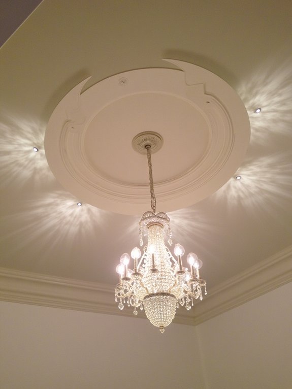 Transform an ordinary tray ceiling into a captivating focal point with cascading crystal elements that catch and reflect light throughout your master bedroom. This sophisticated design combines modern glamour with luxurious ambiance through strategically placed crystal strands.