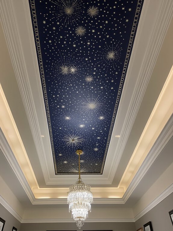 This striking ceiling treatment creates a celestial display in your master bedroom using metallic finishes and strategic lighting. A deep navy base coat serves as the night sky backdrop, while layered silver metallic paint forms ethereal star patterns throughout the recessed tray.