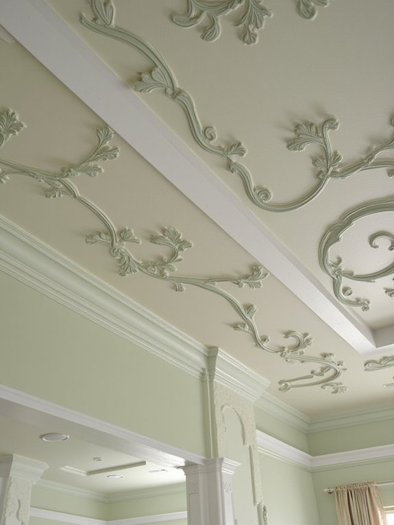 Create an elegant garden atmosphere in your master bedroom with a tray ceiling vine relief design. The natural motif combines organic textures and botanical patterns featuring vine stems and delicate leaf details of varying thicknesses. Earthy tones like sage green and warm bronze enhance the nature-inspired aesthetic.