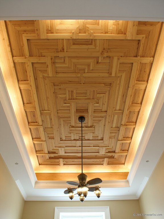 Bamboo planks arranged in geometric patterns elevate standard tray ceilings into striking architectural elements. When installed at 45-degree angles, the 4-inch wide planks create diamond shapes that add visual depth and sophistication to any master bedroom ceiling design.