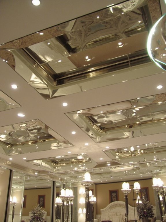 The design can be executed in three distinct ways: symmetric mirror panels arranged in a grid, decorative beveled mirror tiles in artistic patterns, or a single large mirror insert with contrasting trim. When combined with thoughtful lighting placement, these reflective elements produce dramatic effects that transform the ceiling into a striking focal point.