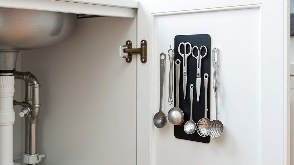 Mounting magnetic strips under your sink is an effective way to maximize storage space and keep frequently used items within easy reach. Start by choosing a suitable spot on the inside of the cabinet door or along the wall where the strip won’t interfere with plumbing or other items. Confirm the surface is clean and dry before attaching the magnetic strip using adhesive backing or screws for a secure hold.