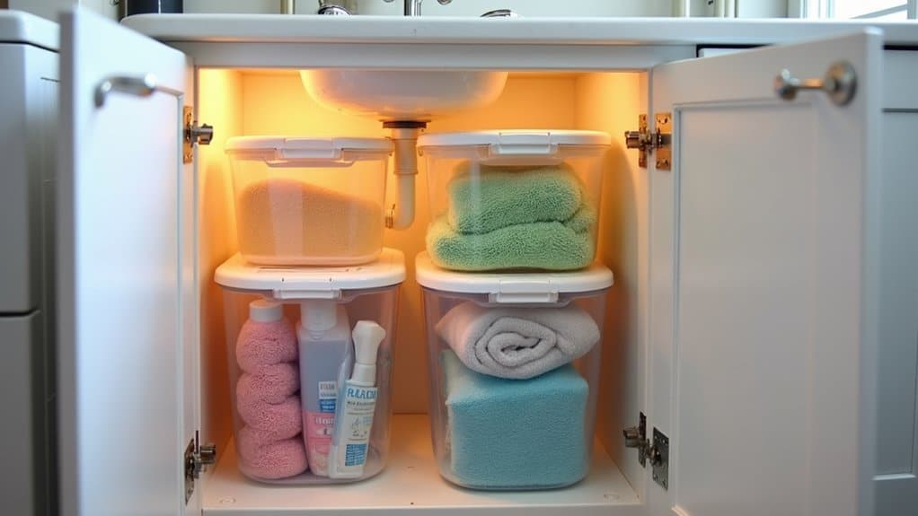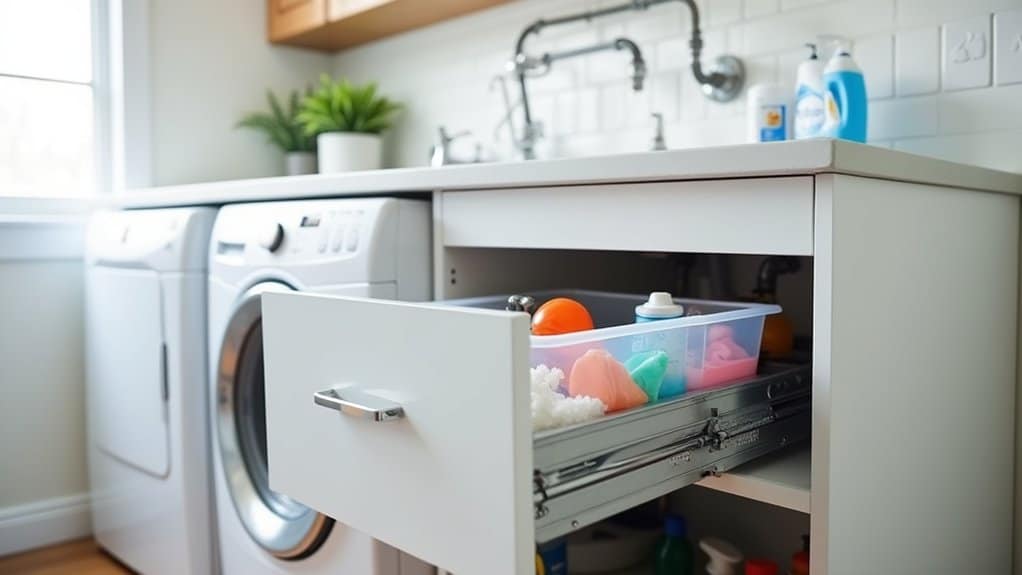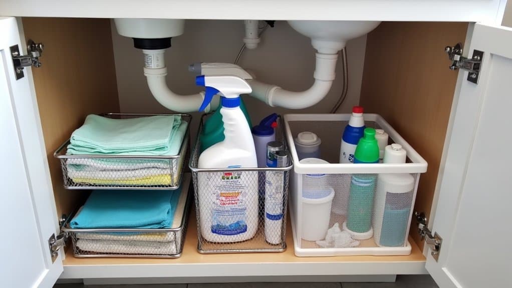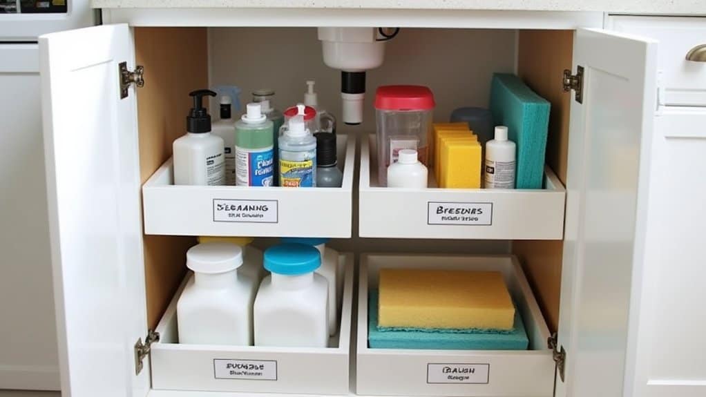 Installing pull-out drawers under your sink can transform a cluttered, hard-to-reach space into an organized and accessible storage area. Begin by measuring the dimensions of your cabinet to guarantee the pull-out drawers you choose will fit, accounting for plumbing and any obstructions. Clear out the existing items, clean the area, and install the drawers according to the manufacturer’s instructions, securing them to the cabinet base for stability.