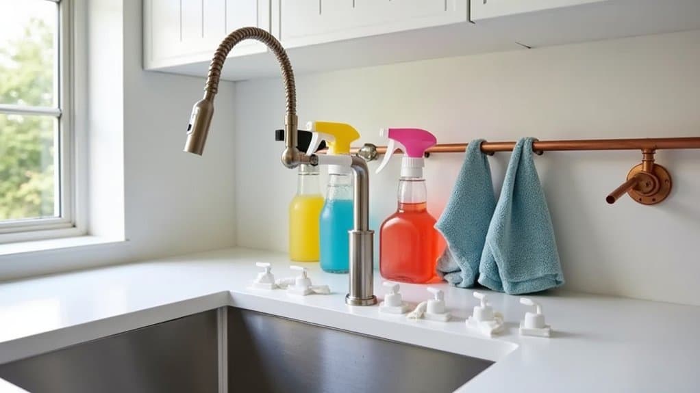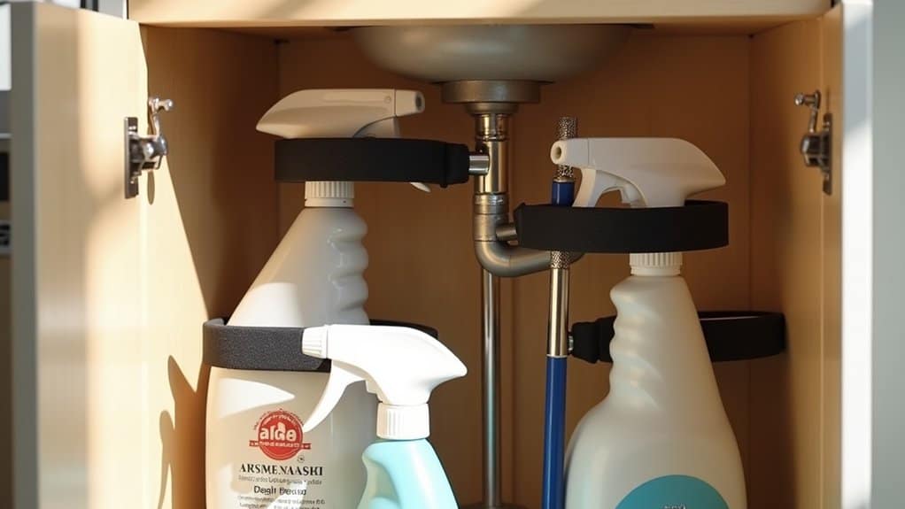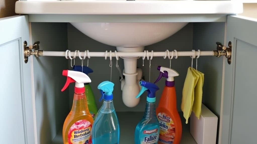 Installing under-sink hooks can be a game-changer for maximizing storage in a cluttered area. Begin by evaluating the underside of your sink or cabinet doors to identify suitable spots for adhesive or screw-in hooks, guaranteeing they won’t interfere with plumbing or other fixtures. Clean the surface thoroughly to ensure strong adhesion if using sticky hooks, or drill pilot holes for a secure fit if opting for screw-in options.