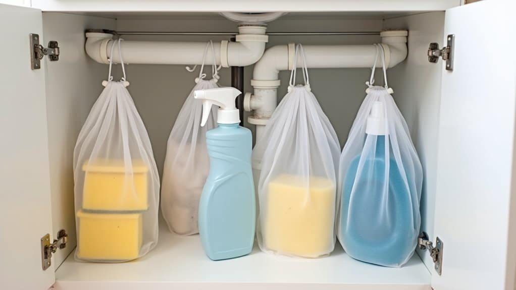 Begin by sorting through the items you plan to store, discarding expired or unnecessary products to maximize space. Fill each mesh bag with related items, such as grouping dishwashing supplies in one and bathroom cleaners in another, making sure not to overfill to maintain visibility and ease of access. Regularly check the bags for clutter or spills, wiping them down as needed to keep the storage area tidy and functional.