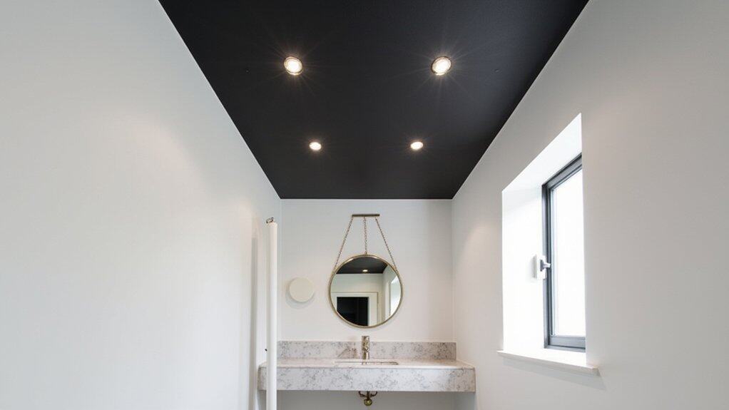 As you explore bold design shifts, consider painting your powder room ceiling a dramatic black for instant impact. This daring choice adds depth and sophistication to a small space, making it feel larger.