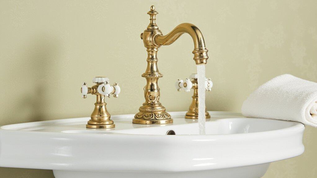 While artistic hand towels add charm to your powder room, don’t overlook the impact of a vintage faucet style. Installing one can transform your space with timeless elegance. Choose a faucet with a classic brass or chrome finish, ideally 8-10 inches wide, to fit standard sinks.