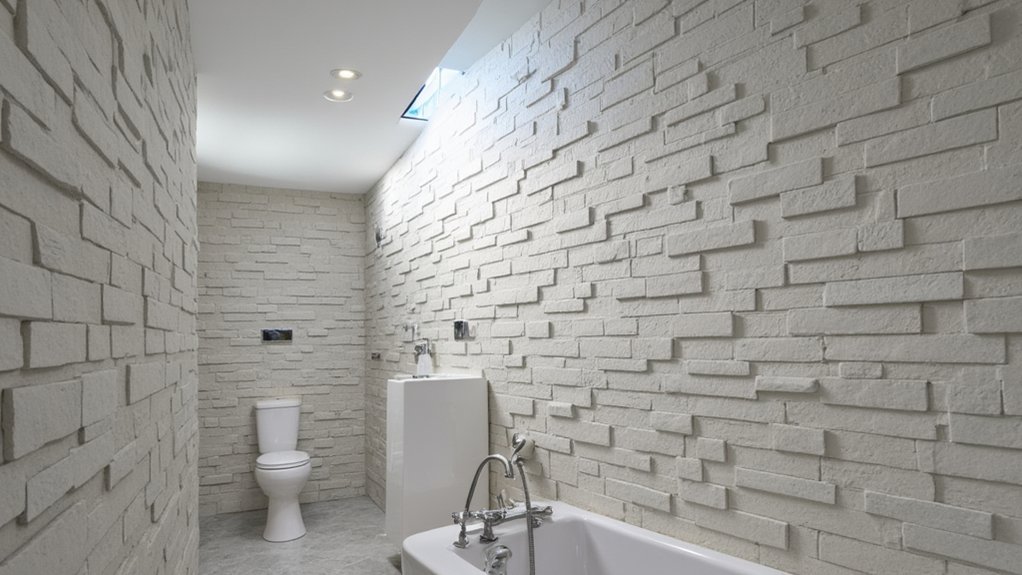 While decorating your bathroom might seem challenging, starting with textured wall tiles can instantly elevate the space. You’ve got options like ceramic or porcelain tiles with 3D patterns that add depth. Install them on a feature wall, measuring about 4×6 feet, over a weekend.