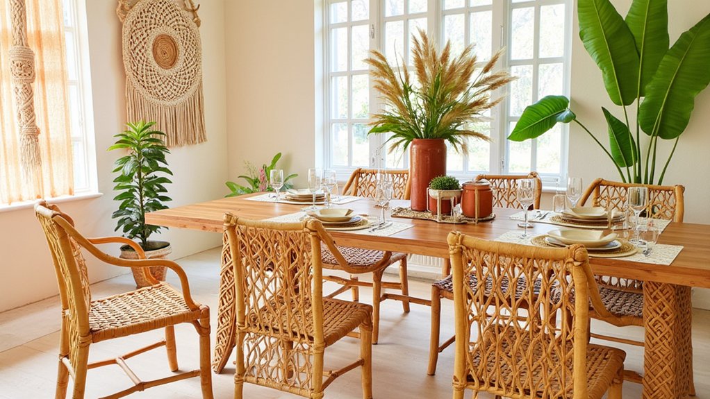 While shifting to a lighter style, consider a Bohemian rattan table to infuse your dining space with earthy charm. Its natural texture and warm tones create a cozy, inviting vibe for family meals. Typically, these tables measure around 60 inches long and 36 inches wide, fitting six comfortably.