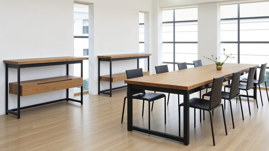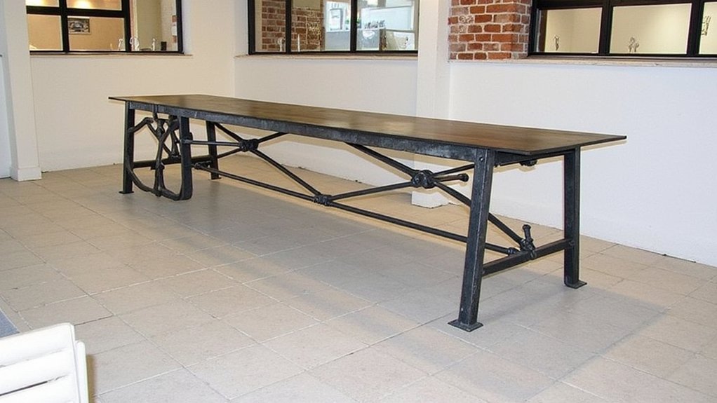 Switching gears from the earthy vibes of a live-edge table, let’s explore the bold appeal of an industrial metal table for your dining space. You’ll love the rugged, modern look it brings with sturdy steel frames and a sleek finish. Typically, these tables measure 72 inches long by 36 inches wide, seating 6-8 comfortably.