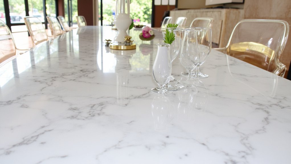 As you explore luxurious options for your dining space, consider the timeless beauty of a marble-topped table. It’s a stunning choice that adds sophistication with its smooth, cool surface and unique veining. Imagine hosting dinner on a 60-inch by 36-inch white Carrara marble table, seating six comfortably.