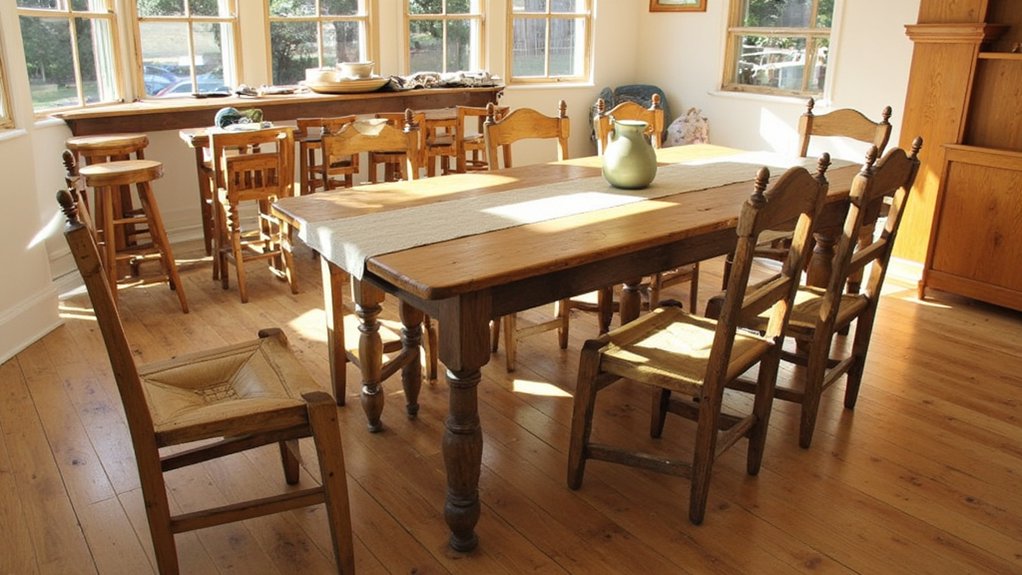 While you might think a dining table is just furniture, a vintage farmhouse table brings rustic charm to your home. It’s perfect for creating a cozy, inviting dining space with its timeless look. Usually, these tables measure around 72 inches long and 36 inches wide, seating 6-8 people comfortably.