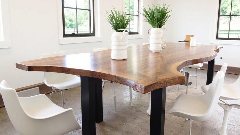 If you’re craving a dining space with natural charm, consider a rustic live-edge table as your focal point. These tables, often crafted from solid wood like walnut or oak, showcase the tree’s raw edges. You’ll love the unique, organic look for a 6-8 foot table seating 6-10 people.