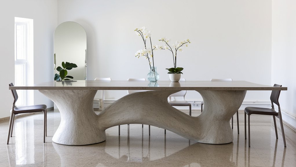 Imagine a dining centerpiece that’s both art and function with a sculptural concrete table in your home. You’ll love the bold, modern vibe it brings to meals. Typically spanning 60-72 inches long and 36 inches wide, it seats 6-8 people comfortably.