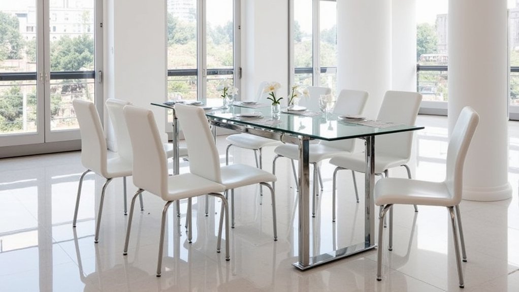 Imagine a dining area that feels sleek and open with a modern glass table as the centerpiece. You’re creating a space that’s stylish and airy with just one piece. A glass table, typically 60-72 inches long and 36-42 inches wide, instantly transforms your room.