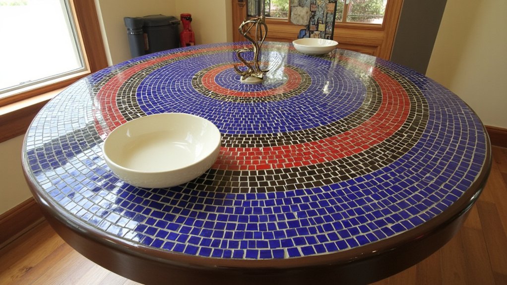 Plunge into the vibrant world of a colorful mosaic table to brighten up your dining space. You’ll transform meals with a 48-inch round table, bursting with hand-cut ceramic tiles in bold reds, blues, and yellows. Craft or buy one within two weeks for a striking centerpiece.