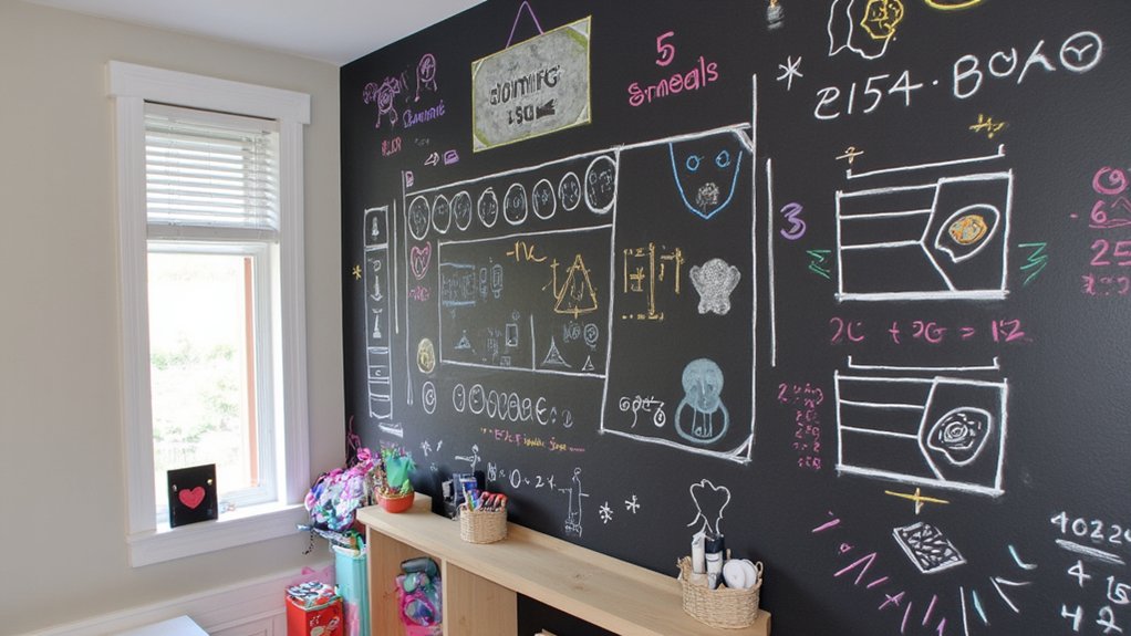 Moving from the personal touch of custom name murals, let’s explore another exciting option for your child’s bedroom with an interactive chalkboard wall. You can transform a dull space into a creative hub by painting a 6×4-foot section with chalkboard paint, which takes about 2 hours to apply and 3 days to cure.