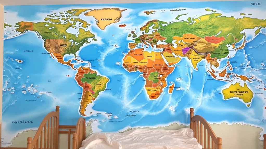 While exploring creative wall designs, let’s plunge into thematic map wallpaper to spark your child’s imagination with a geographic twist. Transform their bedroom into an explorer’s haven by choosing a map design that covers a full wall, ideally 8×10 feet, for maximum impact.