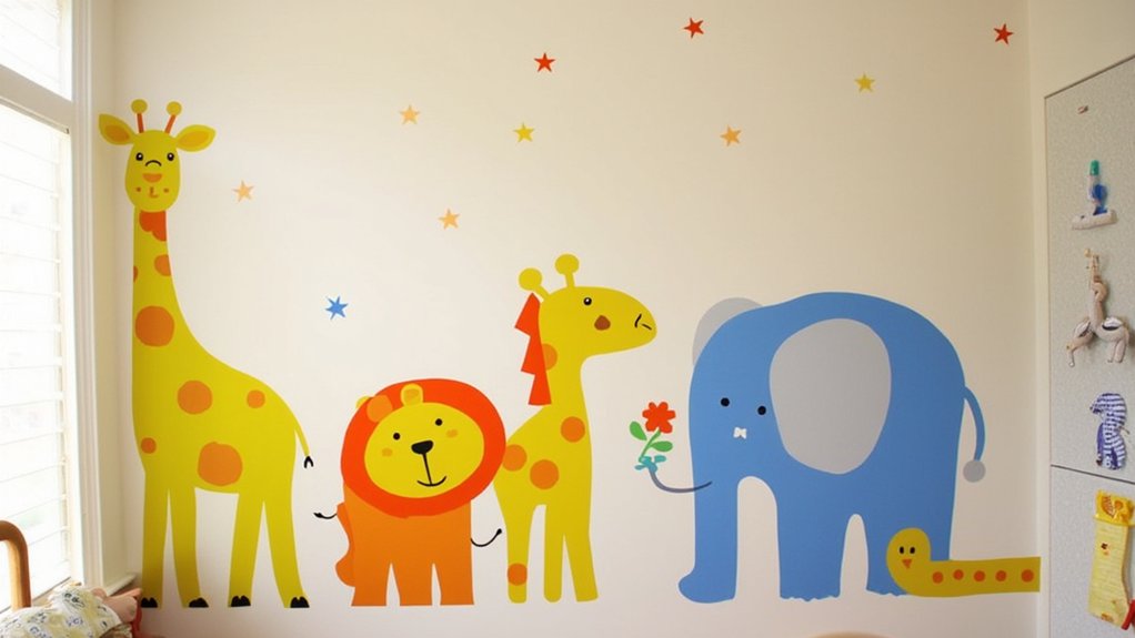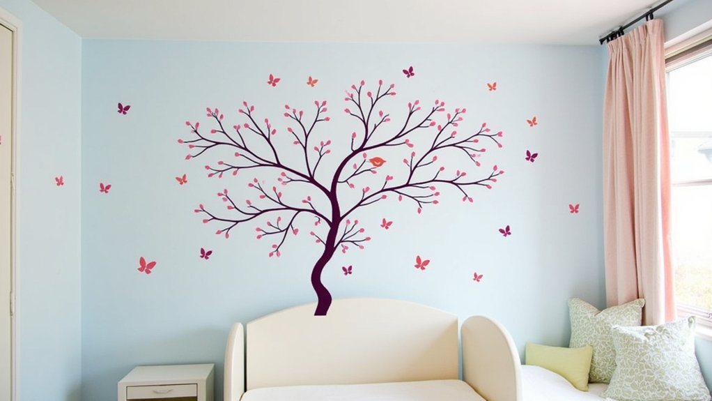 While decorating your child’s bedroom, consider adding whimsical tree decals for a playful, nature-inspired look. These easy-to-apply stickers transform walls into magical forests in under 30 minutes, fitting spaces as small as 4×6 feet. You’ll find them in various sizes, often 5 feet tall, at local craft stores.