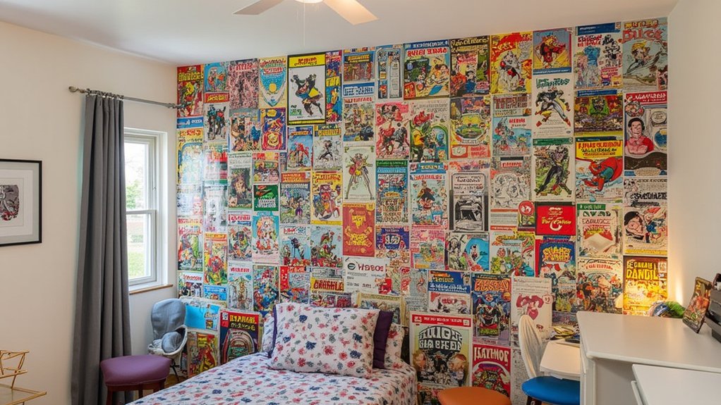 Transform your kid’s bedroom with a vintage comic book collage for a bold, nostalgic vibe. You’ll create a standout wall that’s packed with personality in just a weekend.